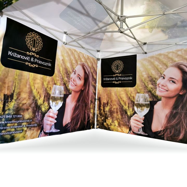 Advertising tents with digital sublimation printing. The printing is done through a chemical process where ink penetrates directly into the fabric's structure under high temperature. Logo, text, or any other type of graphic on the inside or outside of the tent as per the customer's wishes.