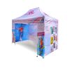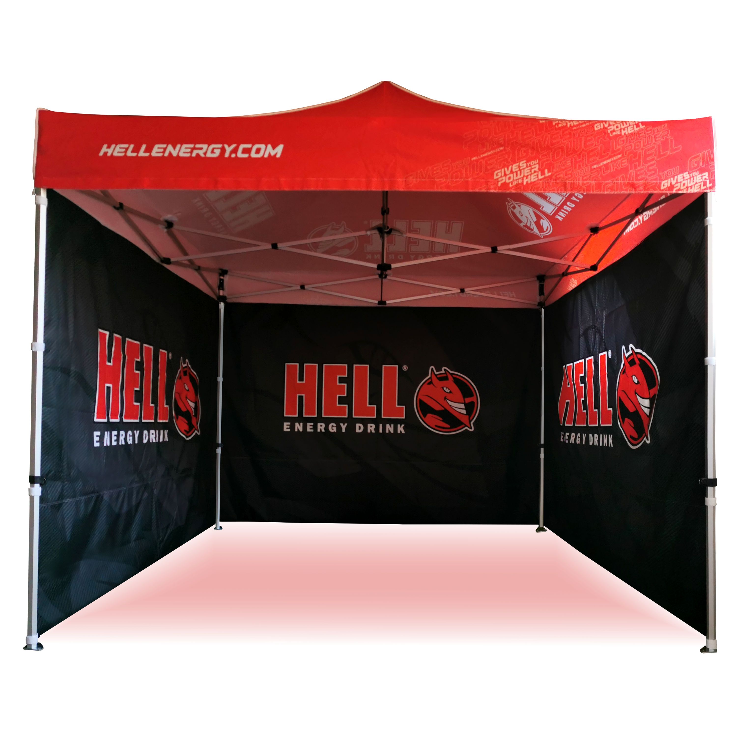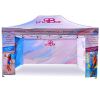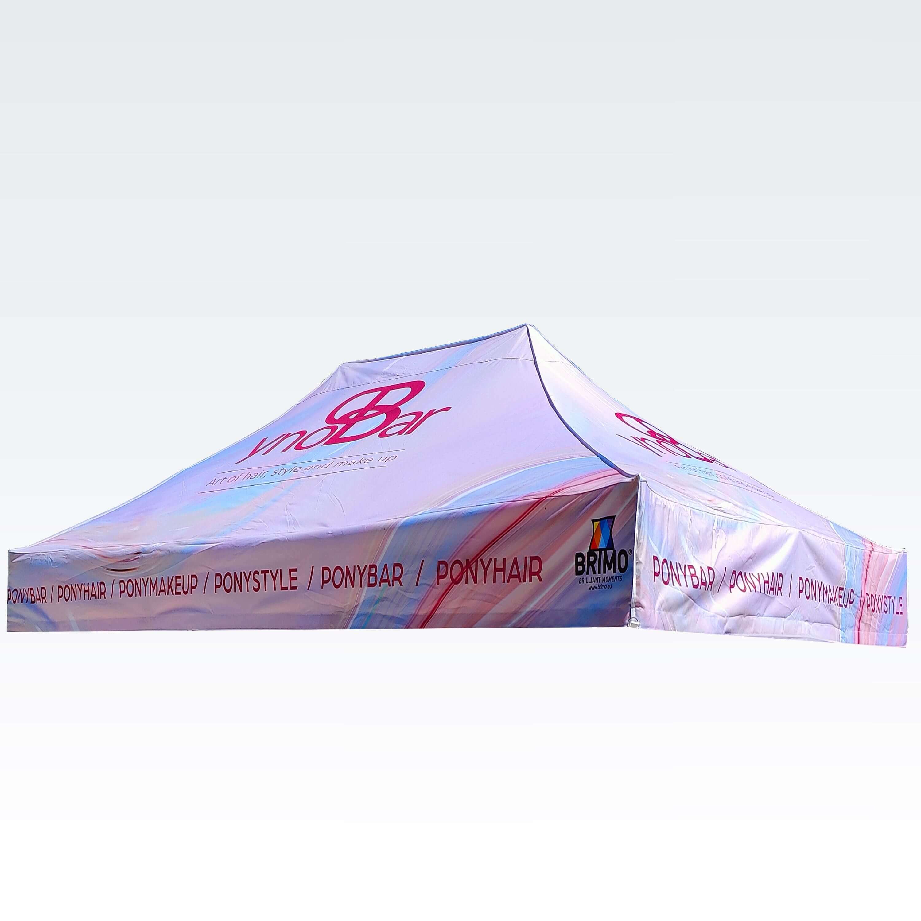 Advertising tents with digital sublimation printing. The printing is done through a chemical process where ink penetrates directly into the fabric's structure under high temperature. Logo, text, or any other type of graphic on the inside or outside of the tent as per the customer's wishes.