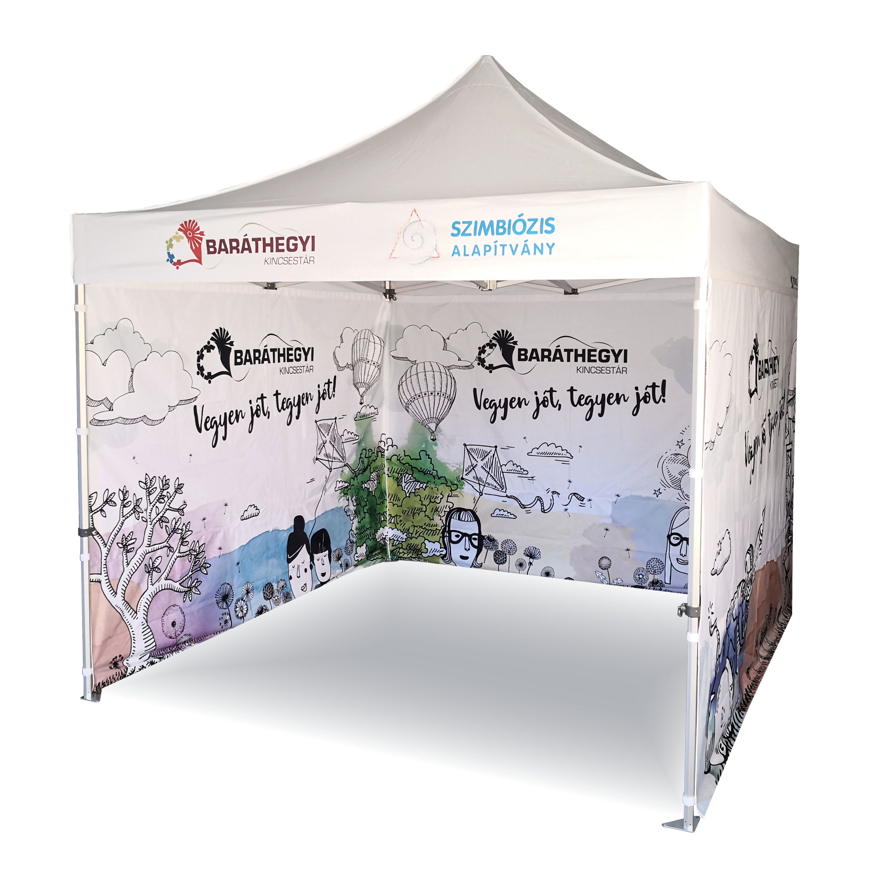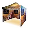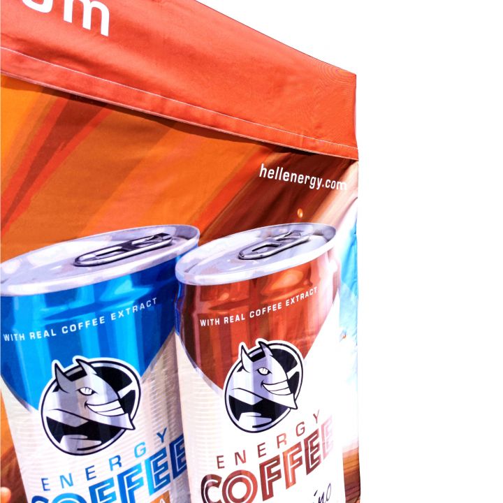 Advertising tents with digital sublimation printing. The printing is done through a chemical process where ink penetrates directly into the fabric's structure under high temperature. Logo, text, or any other type of graphic on the inside or outside of the tent as per the customer's wishes.