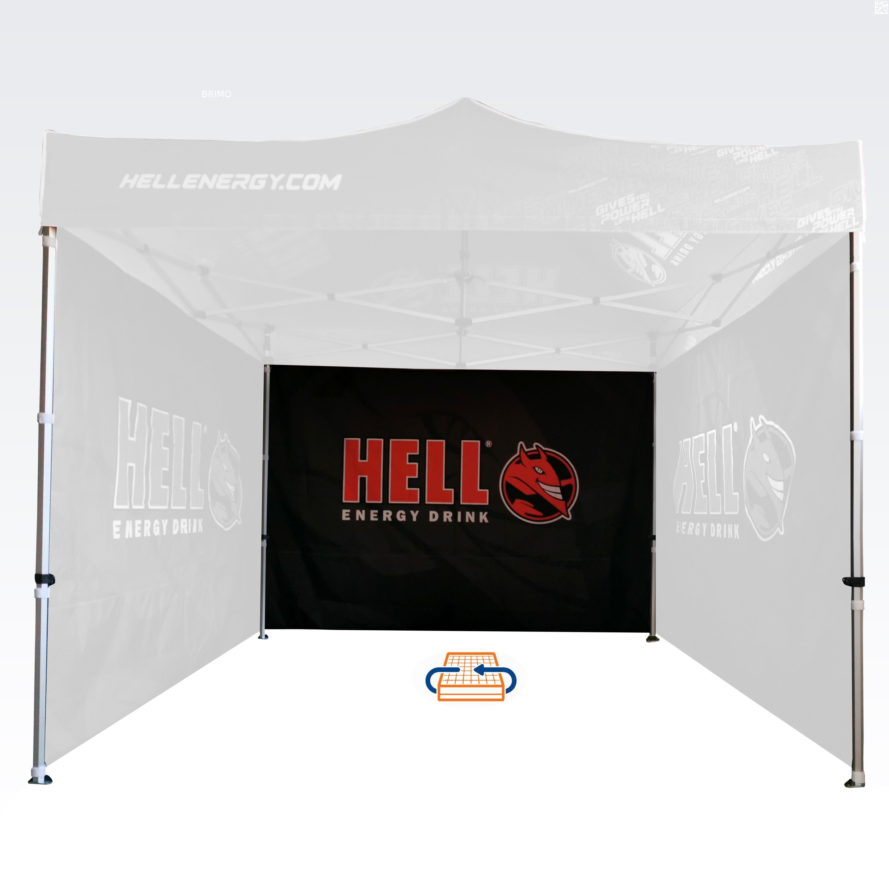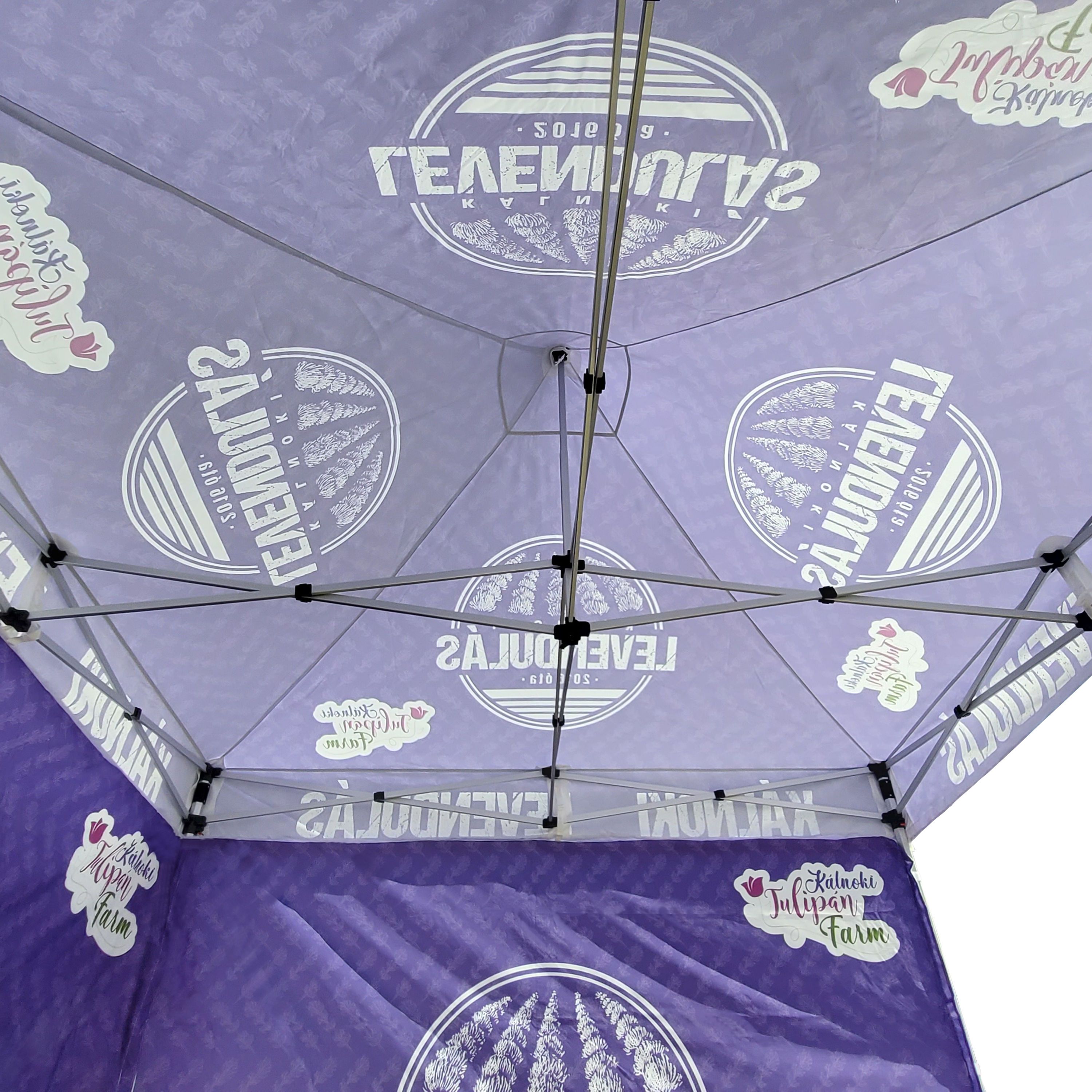 Advertising tents with digital sublimation printing. The printing is done through a chemical process where ink penetrates directly into the fabric's structure under high temperature. Logo, text, or any other type of graphic on the inside or outside of the tent as per the customer's wishes.