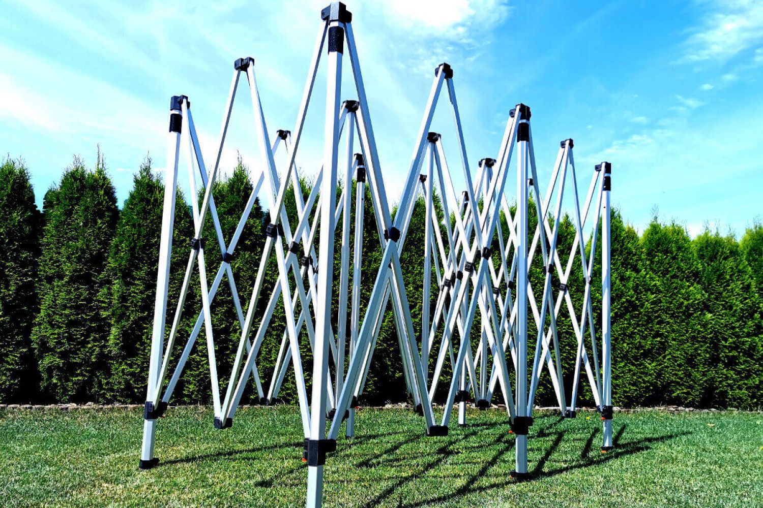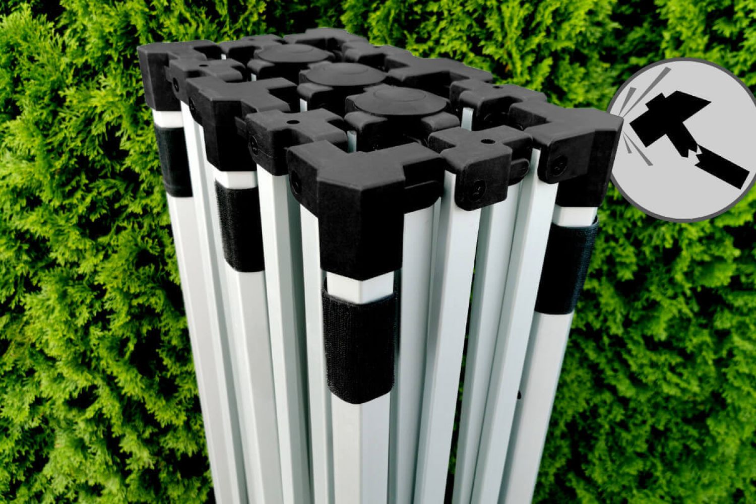 The quick-release mechanism allows you to create a generous covered space for your goods and customers in less than a minute, completely without tools. The foundation of this mobile tent's stability is a robust aluminium profile with a hexagonal cross-section. Thick feet at the bottom of the legs ensure reliable anchoring in the field, while quality screw connections guarantee smooth handling and easy servicing of parts.